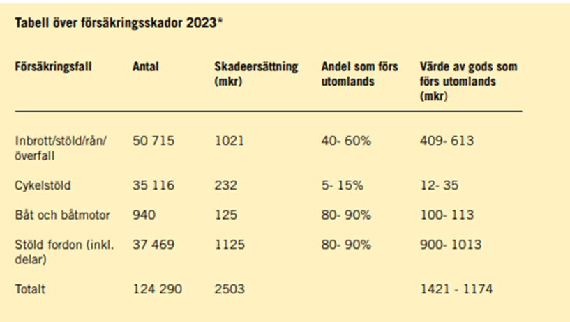 En stor andel av det stulna godset lämnar Sverige. Enligt Larmtjänsts beräkningar försvinner ungefär hälften av det stulna godset utomlands. För stölder av båtmotorer, fordon och bildelar är siffran ännu högre – mellan 80 och 90 procent av det stulna godset tros lämna landet.